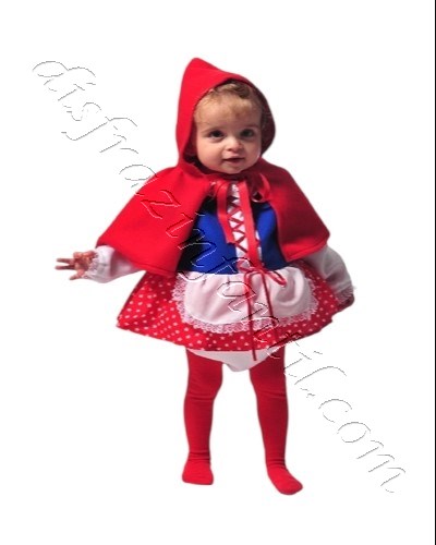 Complementos que incluye: Vestido entero con relleno, cremallera trasera y velcro inferior para el cambio de pañal, leotardo rojo, capa con capucha